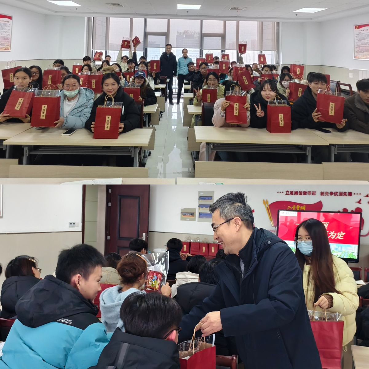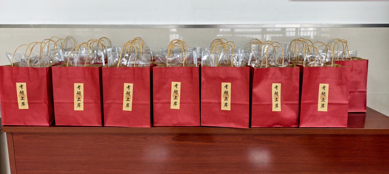 会上,参会领导老师为同学们发放精心准备的考研加油包等考研慰问品,为同学们最后的冲刺加油鼓劲。