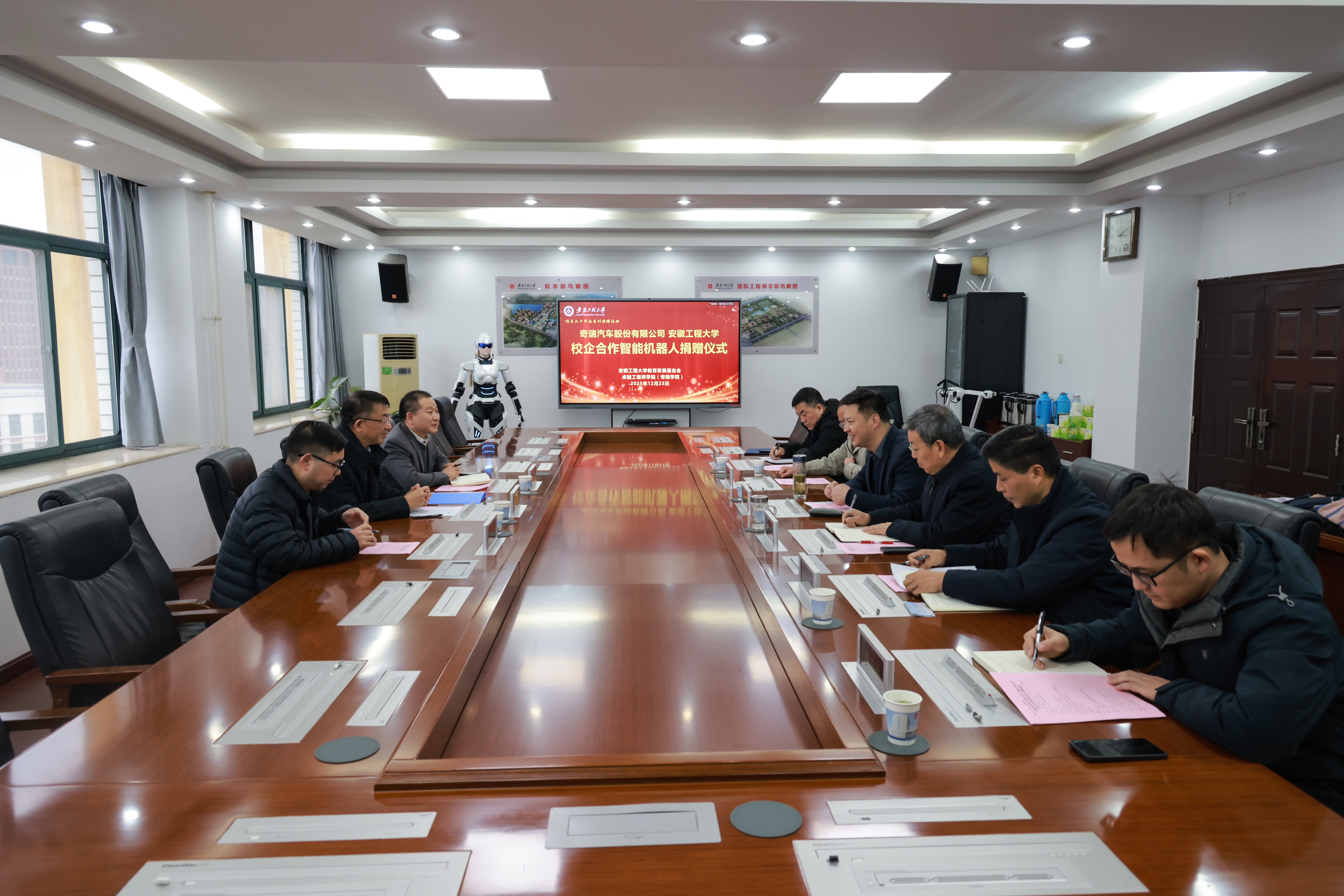 本网讯 12月23日,奇瑞汽车股份有限公司(以下简称“奇瑞汽车”)新闻发言人金弋波、奇瑞国际副总经理兼墨甲机器人副总经理黄招根带队来校捐赠墨茵机器人(Mornine)。捐赠前,校党委副书记、校长黄友锐会见了金弋波一行,对奇瑞汽车的慷慨捐赠致以诚挚感谢。党委常委、副校长凤权,奇瑞汽车人员代表及学校相关职能部门负责人参加活动。