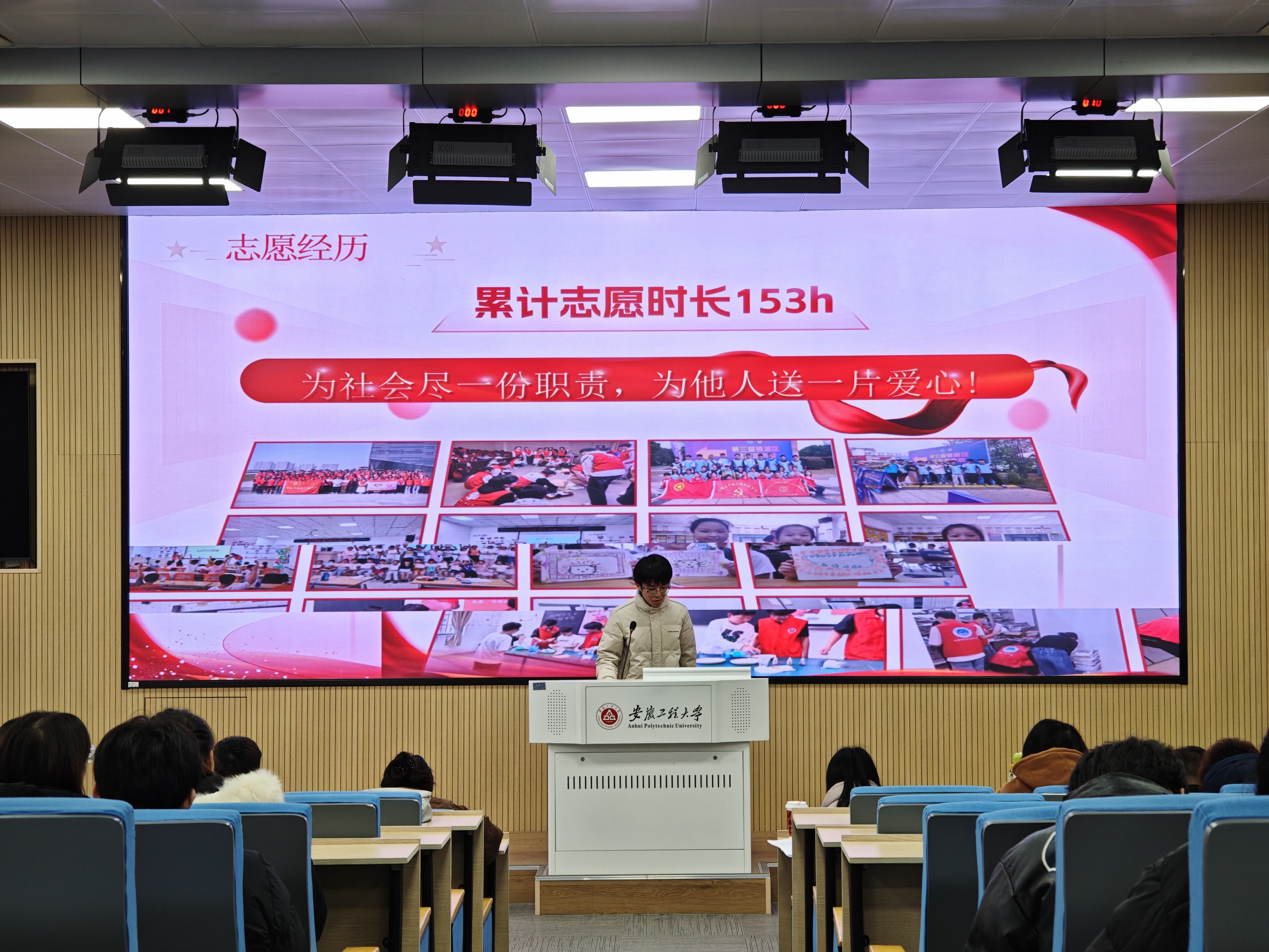 经前期组织推荐与初步遴选,共有25名优秀志愿者进入答辩环节。评审采取量化评分方式,围绕个人综合素质、志愿服务实绩及现场答辩表现等方面进行综合考评。答辩过程中,志愿者通过PPT展示、视频播放等形式,深情讲述了投身乡村振兴、关怀“一老一小”、保障大型赛会等动人经历,分享了对志愿精神的深刻理解与实践体悟,充分展现了我校青年志愿者昂扬向上的精神风貌与扎实专业的服务能力。