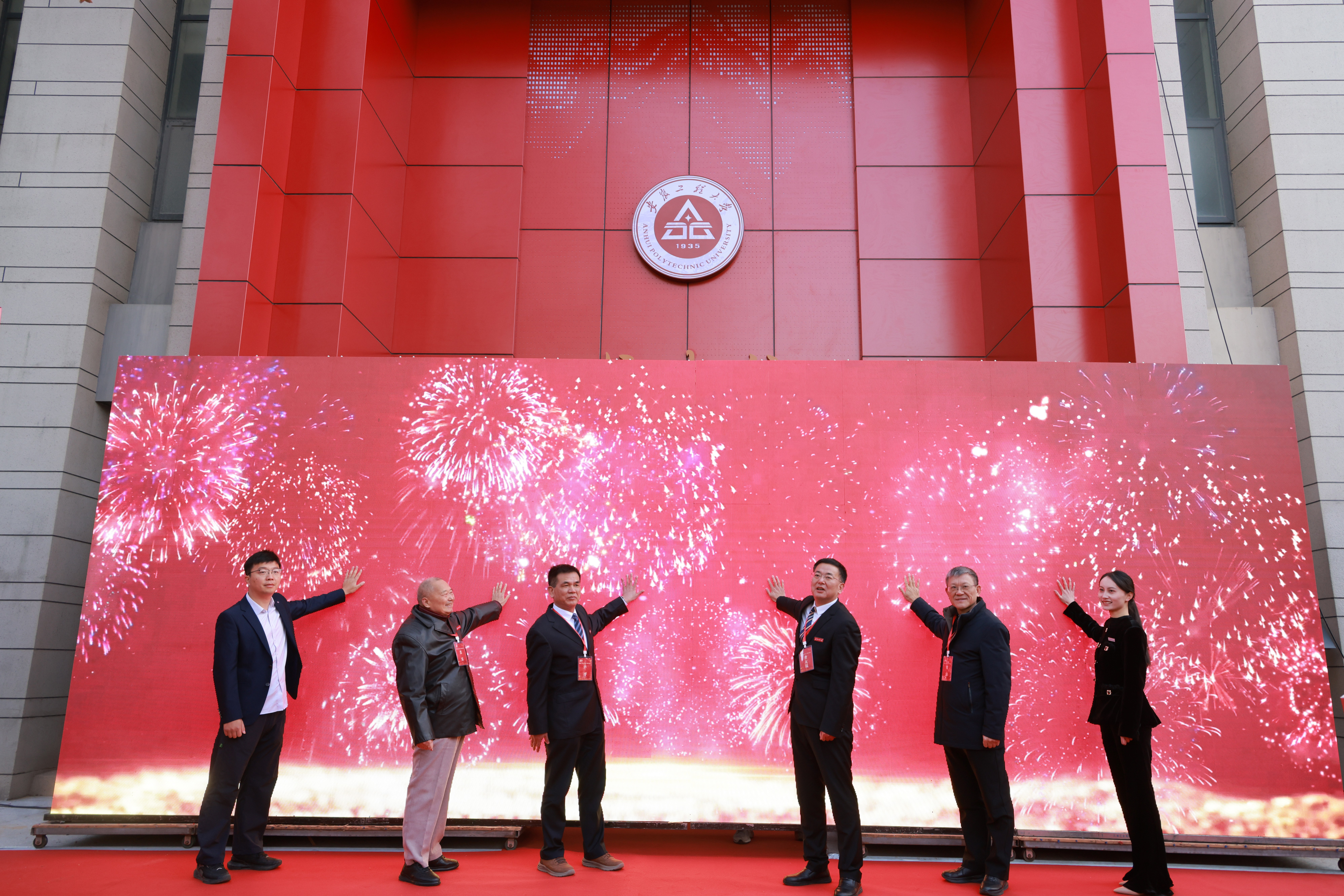 卢平、黄友锐、老领导张宝华、校友代表侯诗益、教师代表李传平、学生代表陈袁共同为校史馆揭幕。