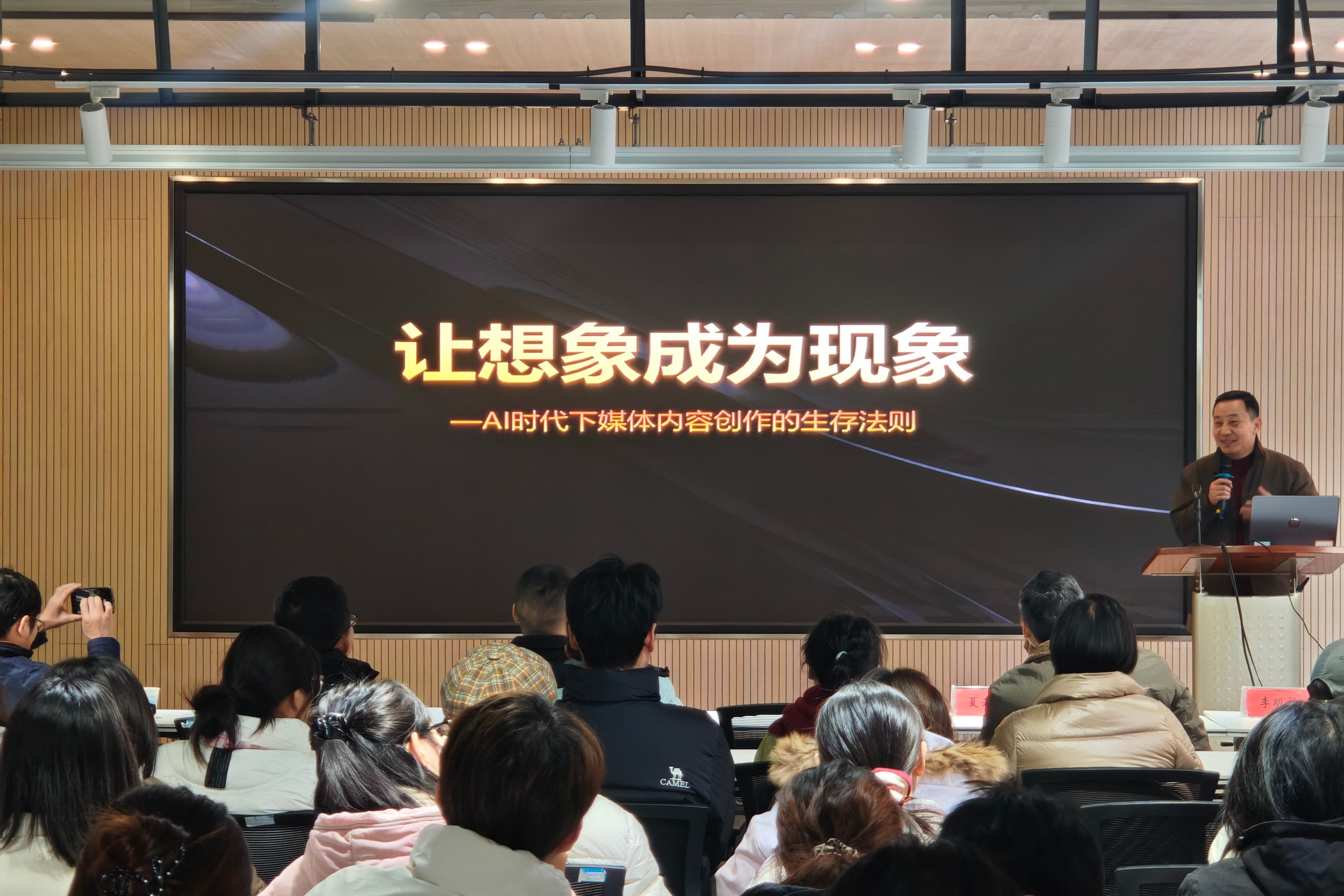四位行业领军校友围绕核心议题展开深度分享。二更文化传媒(深圳)有限公司总经理吕良东以“让想象成为现象——AI时代下媒体内容创作者的生存法则”为主题作了分享。深圳大学美术与设计学院教授、博导陈振旺聚焦“敦煌石窟艺术与现代设计史课程的跨界交叉”,为现代设计注入传统美学基因。安徽顶峰教育投资有限公司董事长夏云兴以“艺创,让乡村更美好”为题,分享乡村艺创实践成果。上海景泰建设股份有限公司董事长李明祥围绕“设计设计”展开论述。