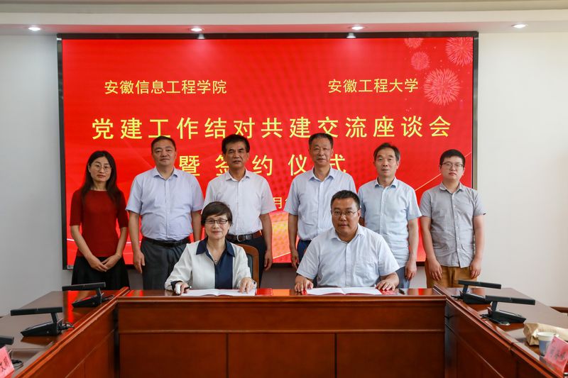 苏国红介绍了学校党建“三抓”工作和主题教育开展情况,并代表学校与安徽信息工程学院副校长、党委组织部部长汪忠国签订两校党建工作结对共建协议。