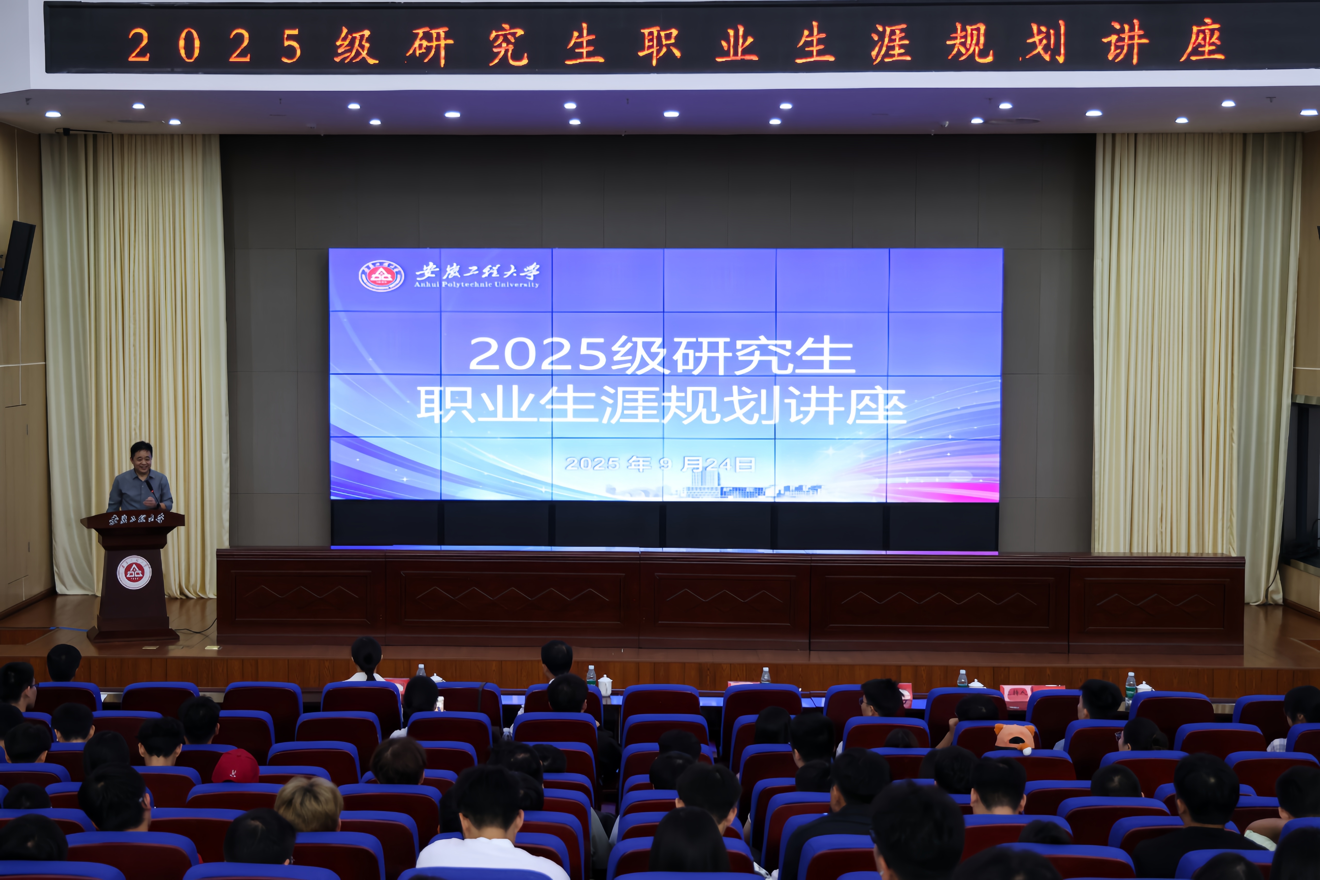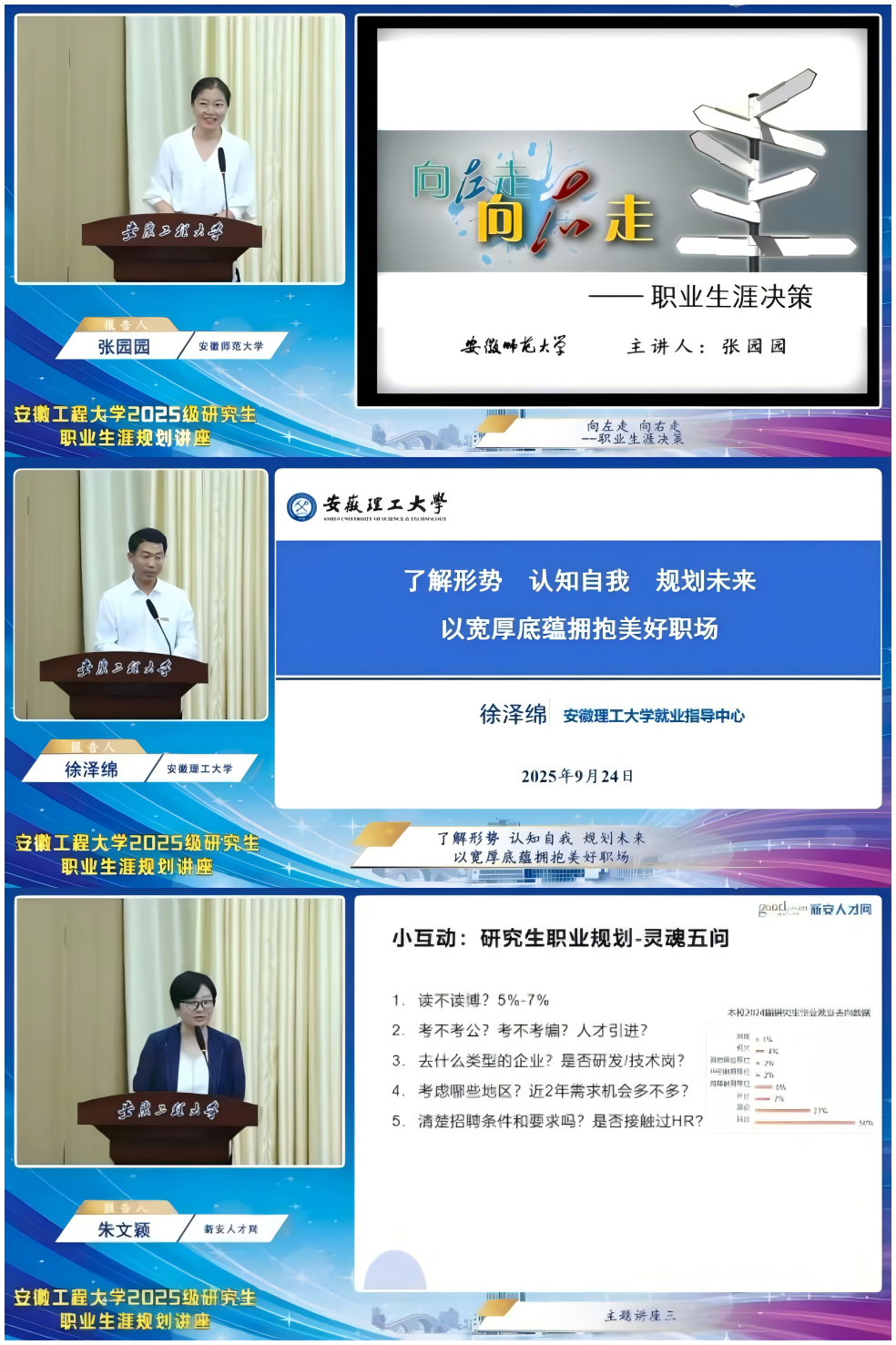 本网讯 9月24日,学校在图书综合楼五楼会议室举办2025级研究生职业生涯规划讲座。校党委常委、副校长张开炳出席活动并致辞。安徽理工大学就业创业指导中心主任徐泽绵,安徽师范大学计算机与信息学院党委书记张园园,新安人才网规划师朱文颖三位专家为同学们作专题报告。