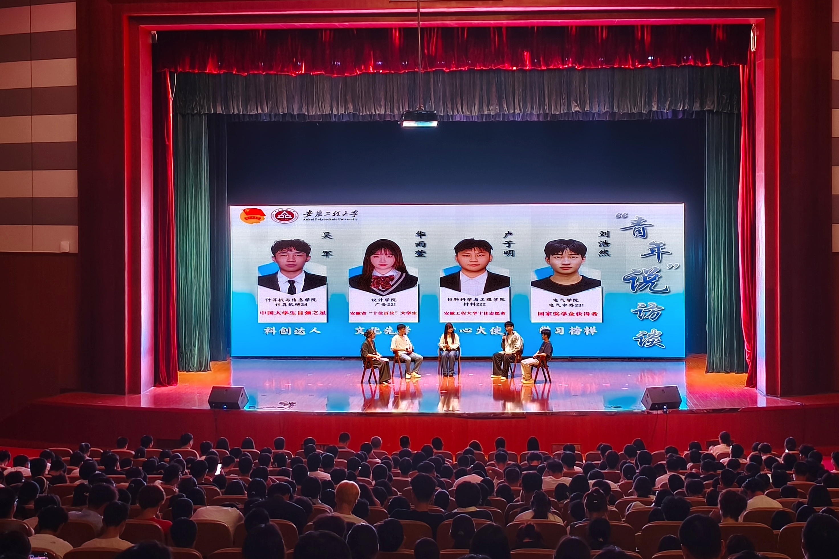 “青年说”访谈环节将整场活动推向高潮。中国大学生自强之星吴军、安徽省“十佳百优”大学生华雨萱、校十佳志愿者卢子明、国家奖学金获得者刘浩然围坐畅谈,分别从自强精神、文艺情怀、志愿服务和专业学习等方面,为新生送上实用“成长锦囊”。