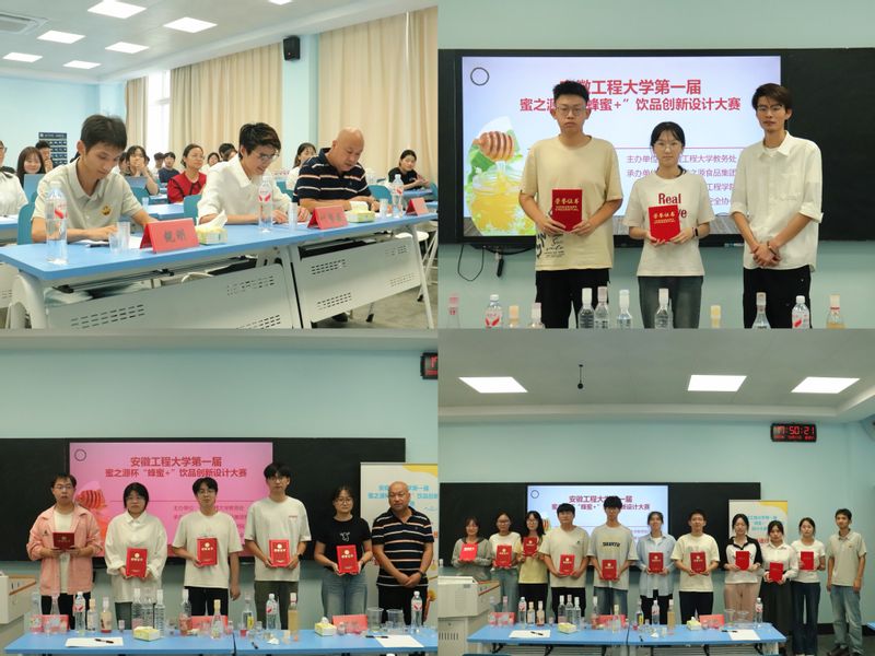 本次比赛邀请安徽蜜之源食品集团有限公司董事长叶繁盛、总经理倪刚,生物与食品工程学院食品科学与工程专业系部主任王顺民、专业教师朱秀灵、朱西平担任大赛评委。大赛以“创新蜂蜜饮品,畅想甜蜜未来”为主题,各参赛队伍通过PPT与实物展示结合的方式,阐释了饮品的创意灵感、技术突破、营养特色与市场前景。评委们围绕作品的创新性、可行性、营养价值与市场潜力等维度点评,并就配方优化、成本控制及生产工艺改进等问题与参赛团队深入交流。