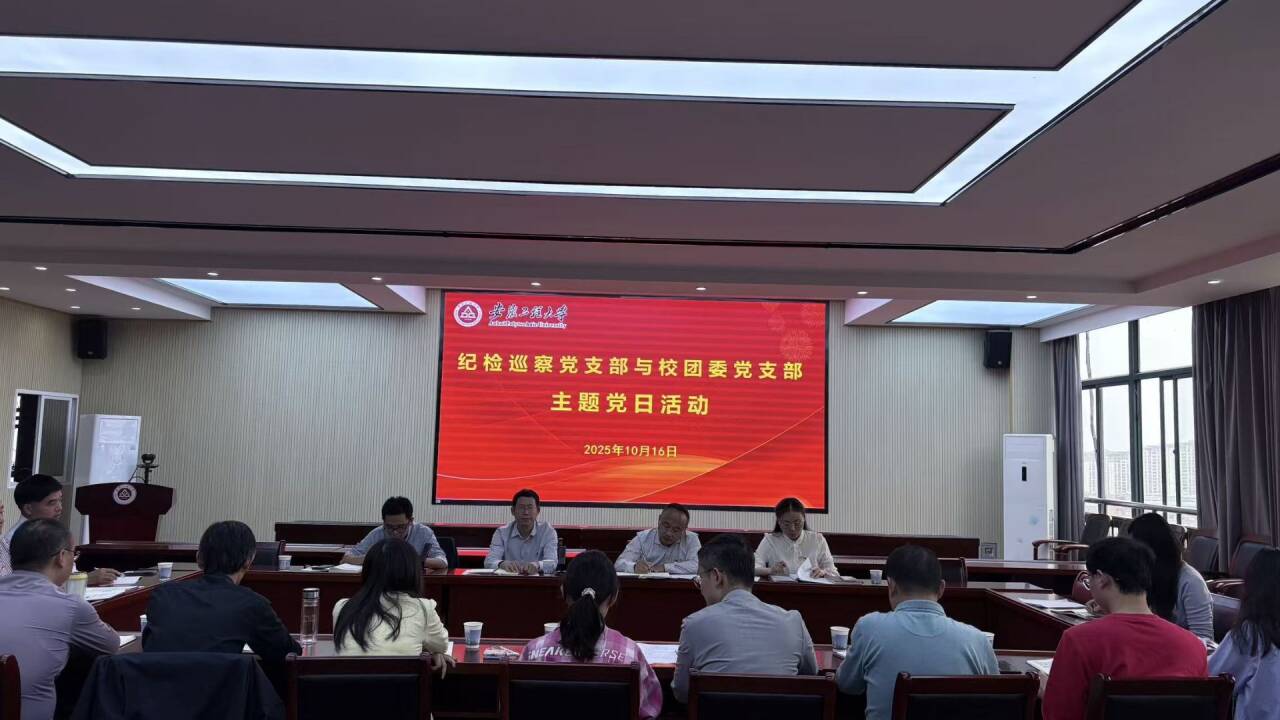 本网讯 10月16日,纪检巡察党支部与校团委党支部在A座1314会议室联合开展主题党日活动。主题党日以“领学+自学+分享学+专题党课”的方式进行。校党委常委、纪委书记、监察专员程双四以普通党员身份参加活动并讲专题党课。