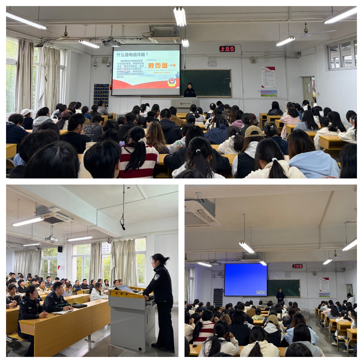 在防范电信网络诈骗宣讲环节,王凡警官结合高校发生的真实案例,深入剖析了当前高发的“刷单返利”“虚假征信”“冒充客服”“网络交友诱导投资赌博”等诈骗手法,反复提醒同学们要时刻保持警惕,不轻信、不转账、不透露个人信息,牢牢守住自己的“钱袋子”。