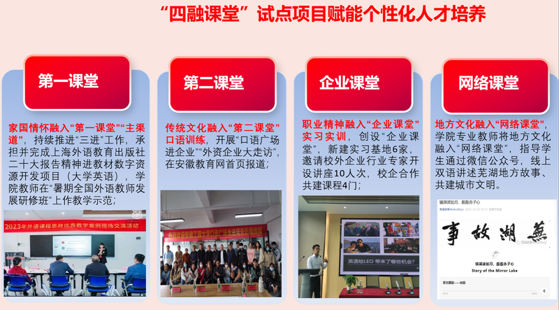 英语系教师党支部党员落实立德树人根本任务,积极探索创新教育模式,在语言教学中巧妙融入思政元素,深层次融入教育教学的各个环节,精心打造“四融课堂”——思政教育与专业知识深度融合,理论教学与实践应用融合,线上学习与线下指导融合,个性化培养与全面发展融合。“四融课堂”的开展增强了学生的文化自信,厚植了家国情怀,实现了语言教学与价值引导的同频共振,满足了学生多样化学习和个性化发展需求,促进了学生在思想、身体、心理等方面的全面发展。“四阶双融”英语口语训练方案在全国外语院长会议上交流,获得全国外语同行院校的广泛肯定,影响力不断扩大。