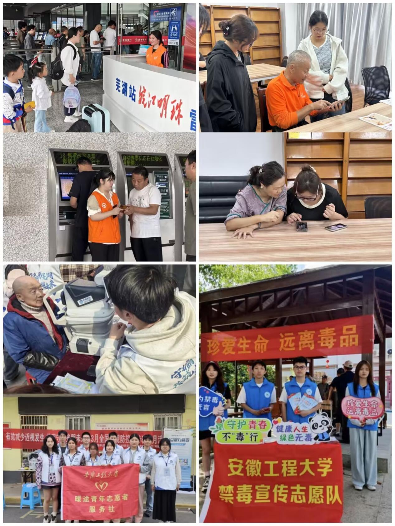 该社团自成立以来,始终秉持“奉献、友爱、互助、进步”的志愿精神,紧密围绕校园与社会实际需求,策划并实施了一系列具有影响力的志愿服务项目。在火车站,志愿者化身“出行助手”,为旅客提供购票引导、行李搬运等服务,温暖旅客出行路;在离退休中心,他们一对一指导老人使用智能手机,用陪伴传递温暖;在“光明芜湖”志愿服务中,志愿者为老人和孩子测量视力,普及护眼知识,守护群众视觉健康;在禁毒宣传活动中,他们通过案例讲解与互动演示,增强公众防毒拒毒意识;志愿者们面向大一新生开展普通话推广活动,助力学生语言表达能力提升;在“学雷锋活动月”期间,他们为多项体育赛事提供志愿服务,展现我校学子昂扬向上的精神风貌。