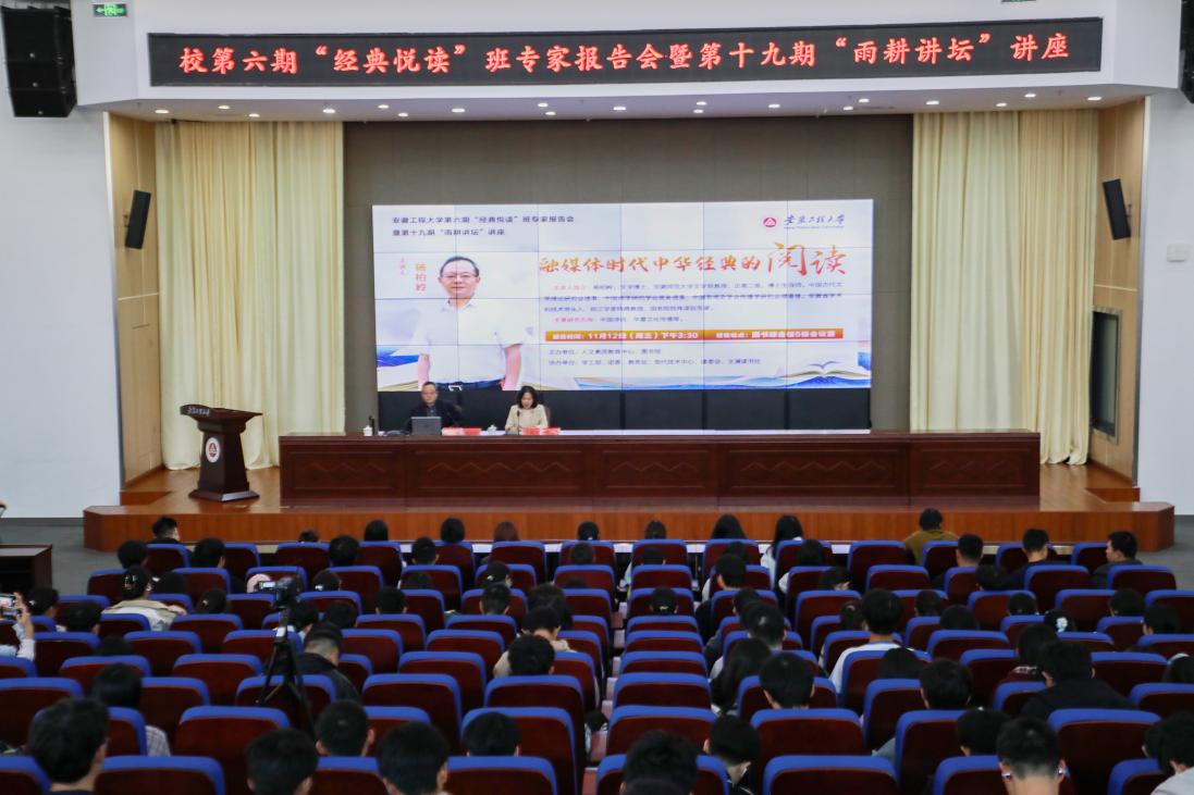 本网讯 11月12日,校第六期“经典悦读”班专家报告会暨第十九期“雨耕讲坛”讲座在图书综合楼5楼会议室举行。安徽师范大学博士生导师、中国古代文学理论研究会理事、中国词学研究学会常务理事、安徽省学术和技术带头人、皖江学者特聘教授杨柏岭教授应邀作题为《融媒体时代中华经典的阅读》的报告。“经典悦读”班和“雨耕讲坛”共800余名师生参加。报告会由图书馆馆长李琛主持。