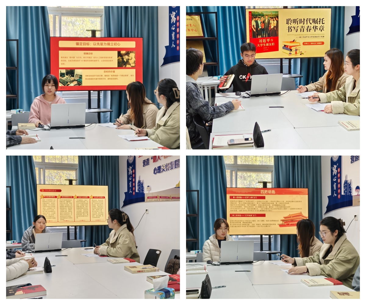 活动伊始,瞿陆子慧带领大家共同选读了《习近平与大学生朋友们》部分章节,并结合实际分享了学习体会。她说,“这部著作生动展现了习近平总书记对青年一代的亲切关怀和殷切期望,大家要结合自身学习生活,用心体会、学思践悟,真正把习近平总书记的嘱托转化为成长动力和行动自觉。”在交流环节,同学们踊跃发言,现场气氛热烈。计算机(拔尖)241陆颖结合《觉醒年代》一书,回顾了早期中国共产党人的奋斗历程,并结合自身经历,号召大家以先驱为镜立初心,把家国情怀落到日常;计算机244钟欣嫒分享了阅读《红星照耀中国》的感悟,表示要从革命先辈身上汲取精神力量,勇担时代使命;软件244贾含笑围绕《红岩》中革命者的英勇事迹,阐述了坚定信仰和严守纪律的重要性;软件231徐振洲结合专业特色和个人经历,分享了自己对《习近平与大学生朋友们》中“自找苦吃”的理解,并呼吁同学们珍惜当下,奋发有为。