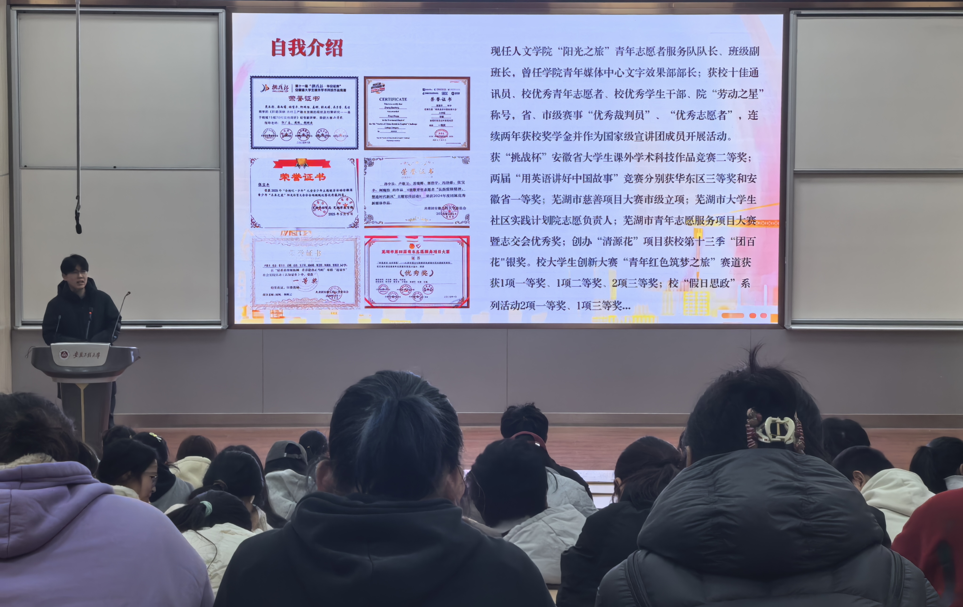 张宝丰以“与志愿同行”为主题,生动分享了“山樱花”盲校志愿行、“清源花”智法护老辨伪行动等特色项目的开展过程与成果。他以“清源花”项目为例,从时事热点与实际问题切入,系统解析了项目从可行性论证到落地见效的创新路径。张宝丰还结合志愿服务中遇到的突发情况,分享了应对技巧与心态调节方法,鼓励同学们在奉献中锻炼能力、在服务中实现成长。